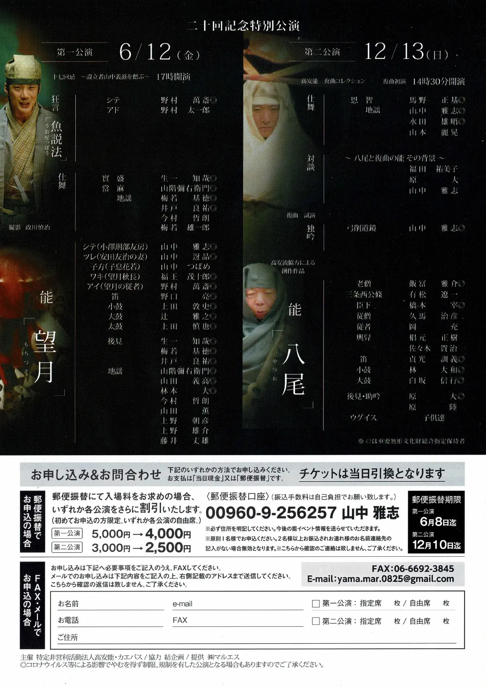 八尾の地名のいわれを元に創作の《八尾(やつお)》では、ウグイス役の子方(小~中学生)を公募して、お稽古の後、出演していただく予定です。